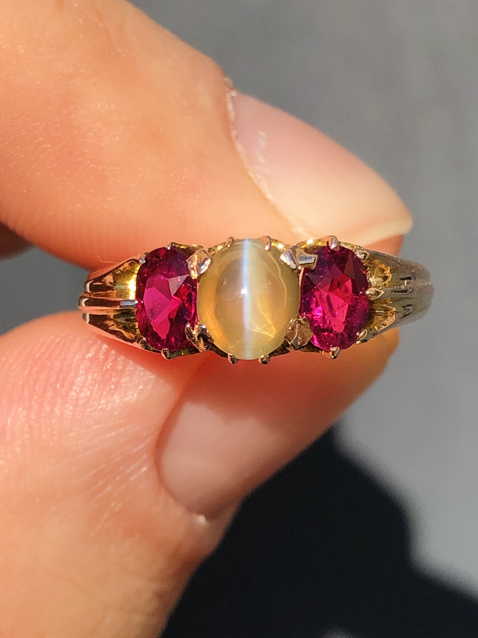 Amazing Antique Victorian Natural Ruby & Cats Eye Three Stone Signet ring 9ct Gold