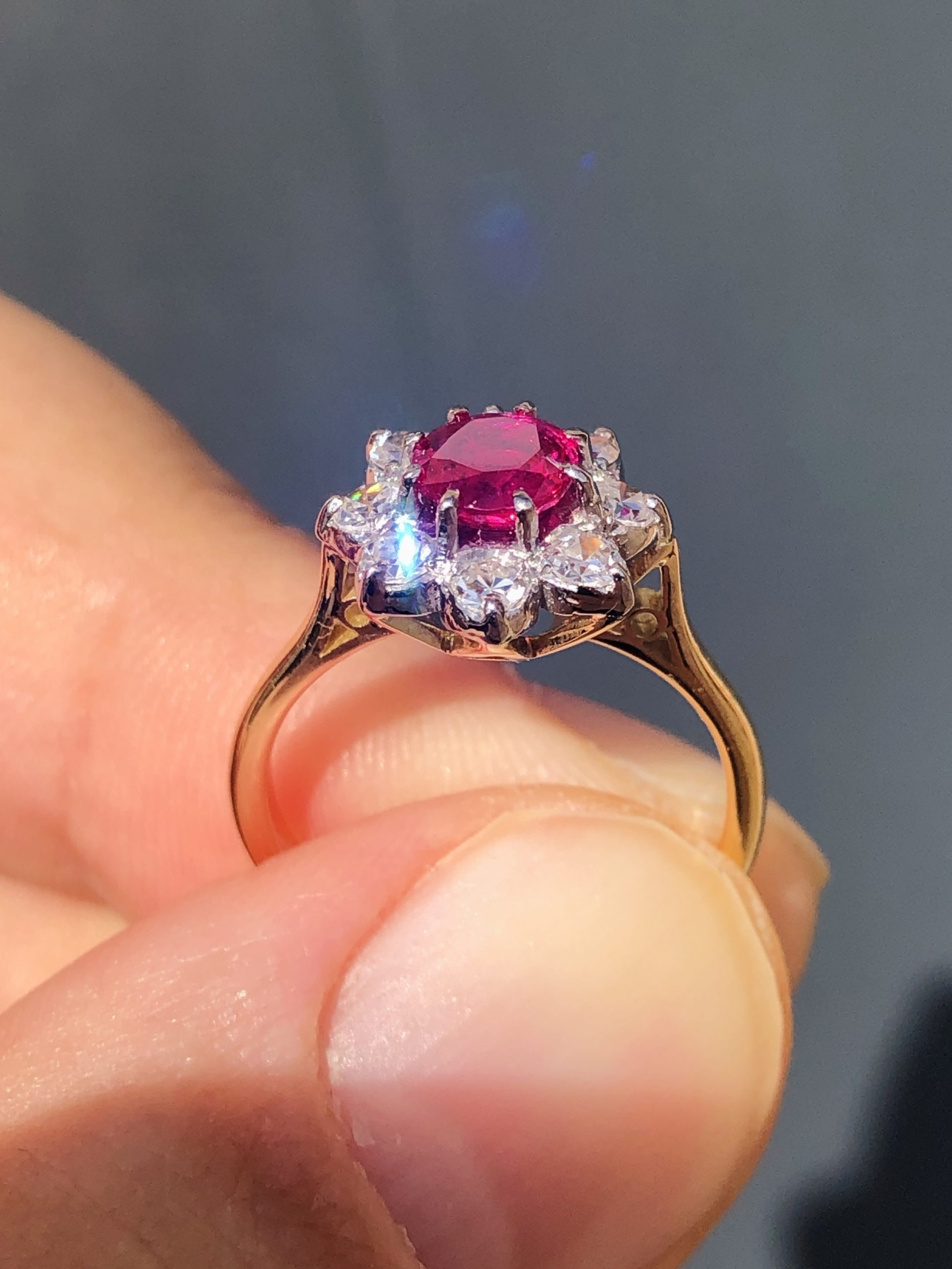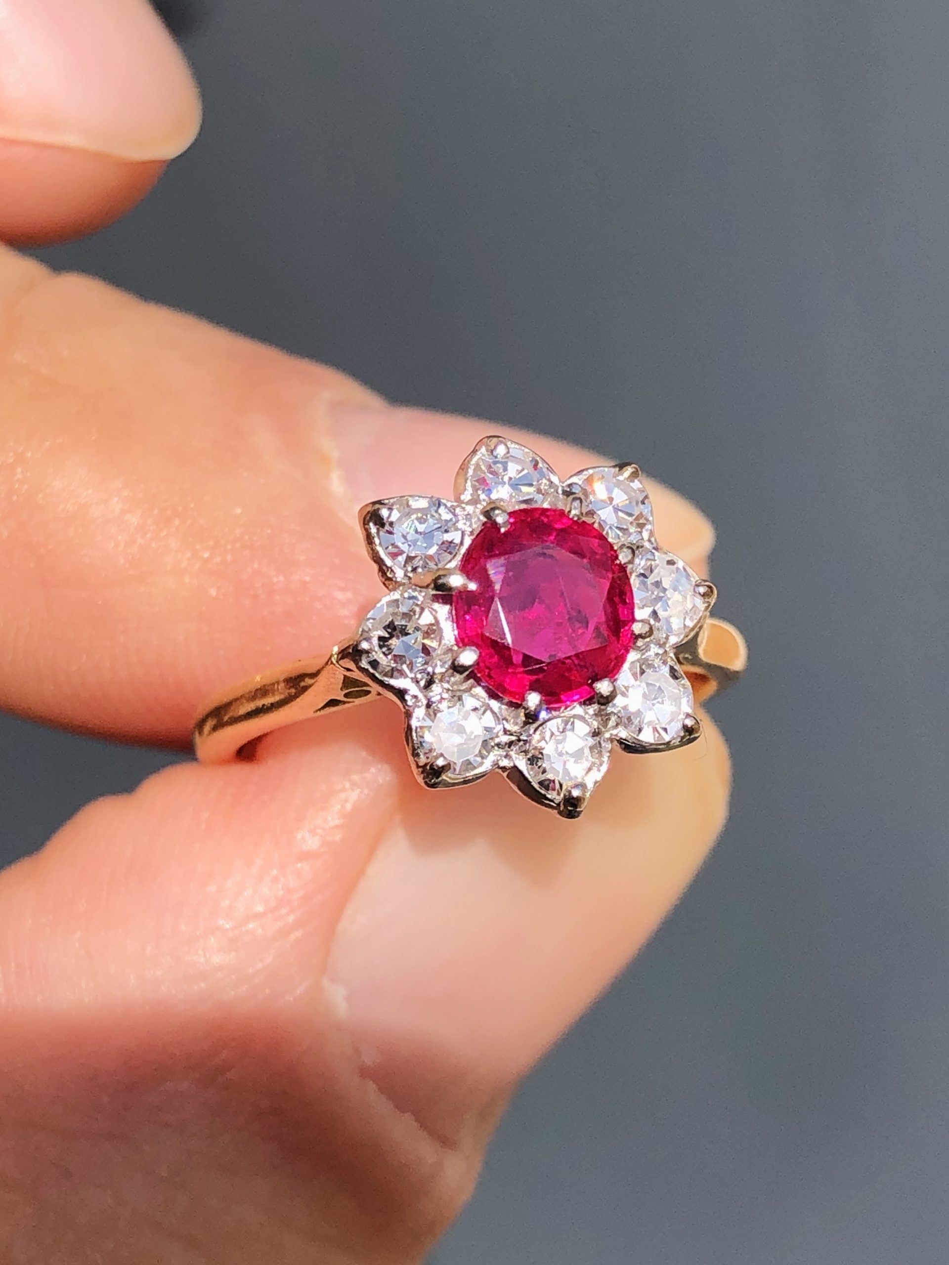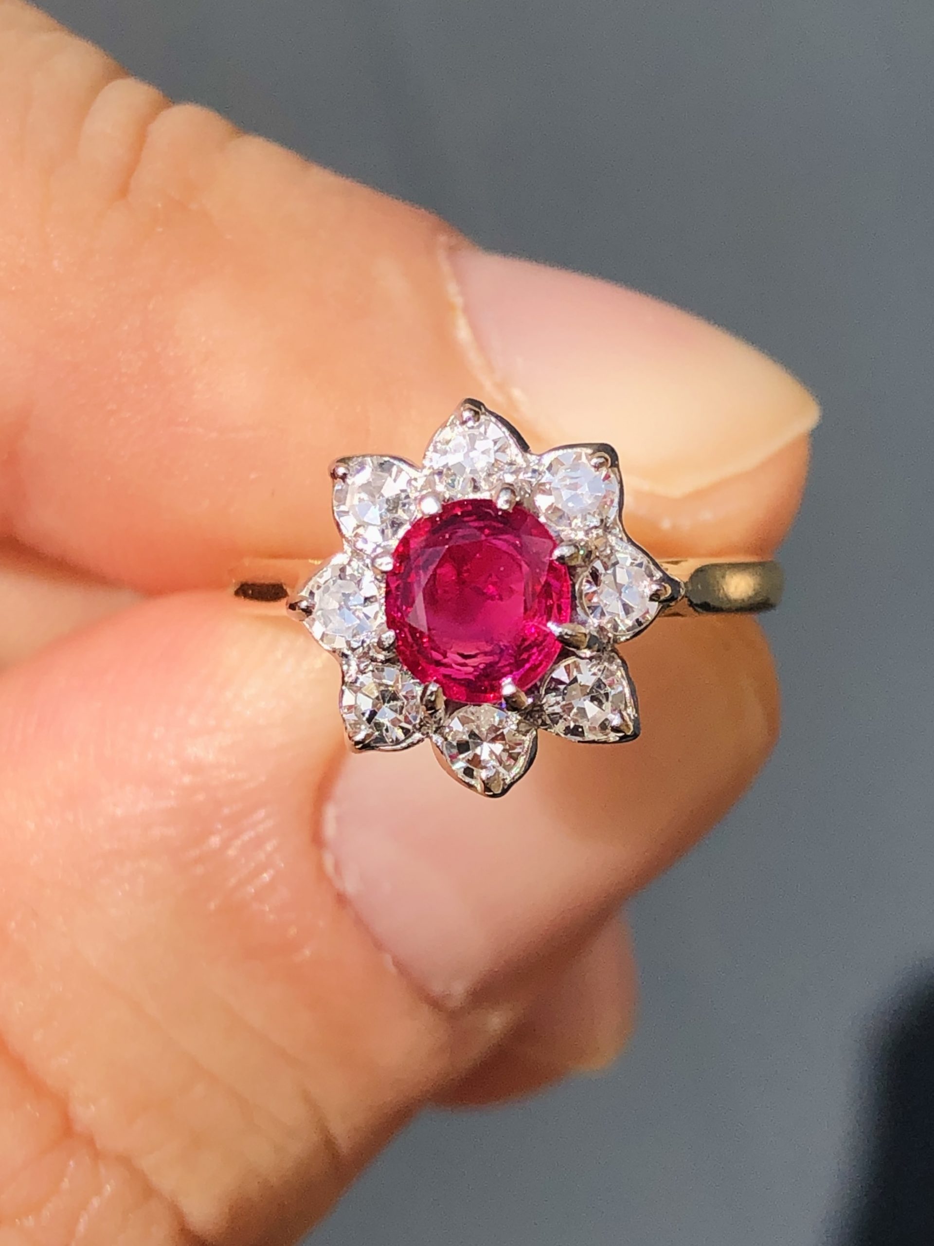 This classical antique treasure, has been set with a very high quality natural untreated old cushion cut Burmese ruby. This gem has that wonderful combination of rich blood red tones and subtle pinks that has made this gem so loved and converted. The ruby has an amazing natural glow to it especially so when in sunlight as you would imagine. Set all the way around this stunning old Burmese treasure, we then have a collection of very well-matched ice white colourless old round cut diamonds. These diamonds are all eye clean stones with that rare to find pure ice white colour. They frame the ruby so well and just add that perfect finishing touch and added fire that diamonds always do so well.