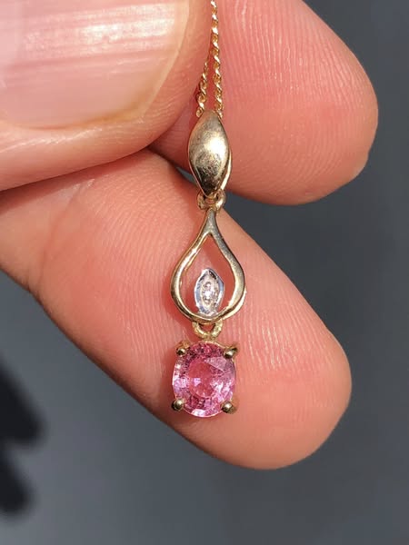 Beautiful natural Old Ceylon Padparadscha Sapphire & Diamond Drop pendant 9ct Gold