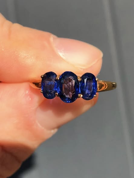 stunning Natural Kyanite cluster three stone ring 9ct yellow gold – size R & half
